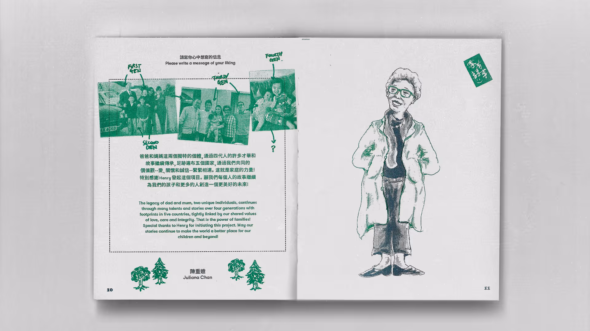Coming from a close-knit extended family from Hong Kong where big and loud family gatherings are a common affair, the covid years brought that to an abrupt halt. Longing for these moments, I decided to create a book where we celebrated our family whilst giving my relatives an opportunity to fill in a page to share any thoughts in any form they wanted to.
