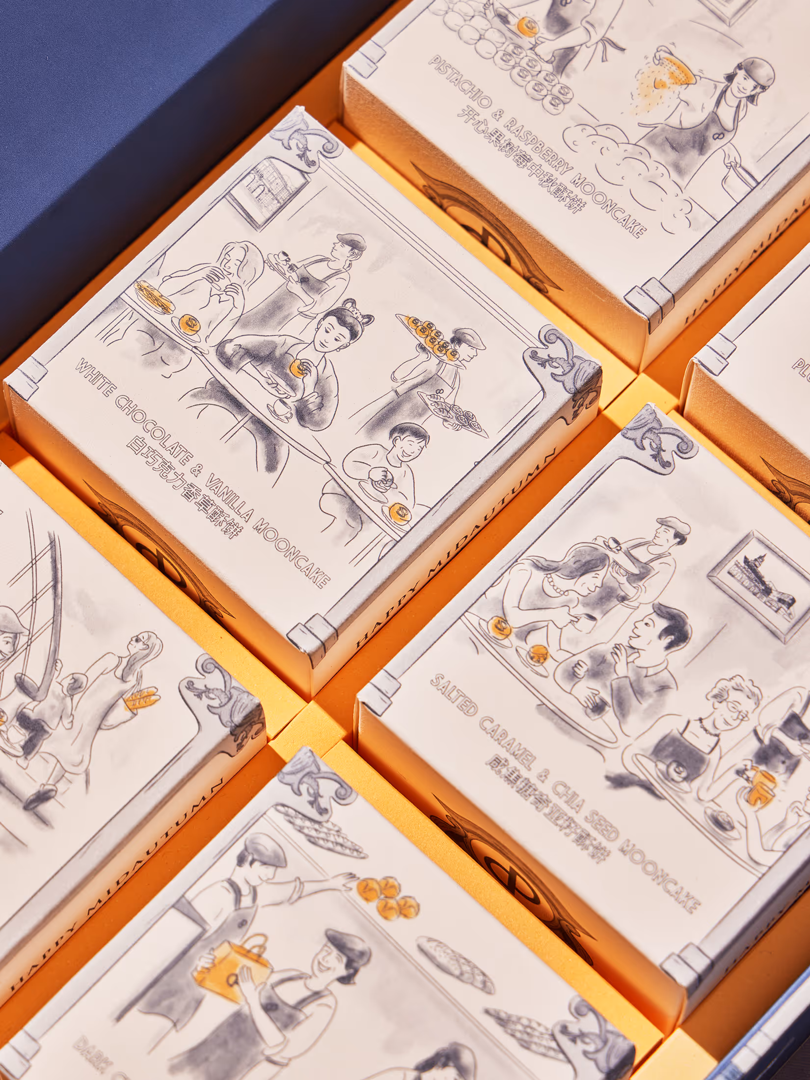 The theme of day and night pays homage to the PAIN CHAUD team and others within the baking and catering industry working day and night to deliver quality to their loyal customers. Through every window, whether it is a baker from PAIN CHAUD hard at work prepping or a customer feasting on a mooncake, this design aims to capture the happy moments of the entire PAIN CHAUD experience.