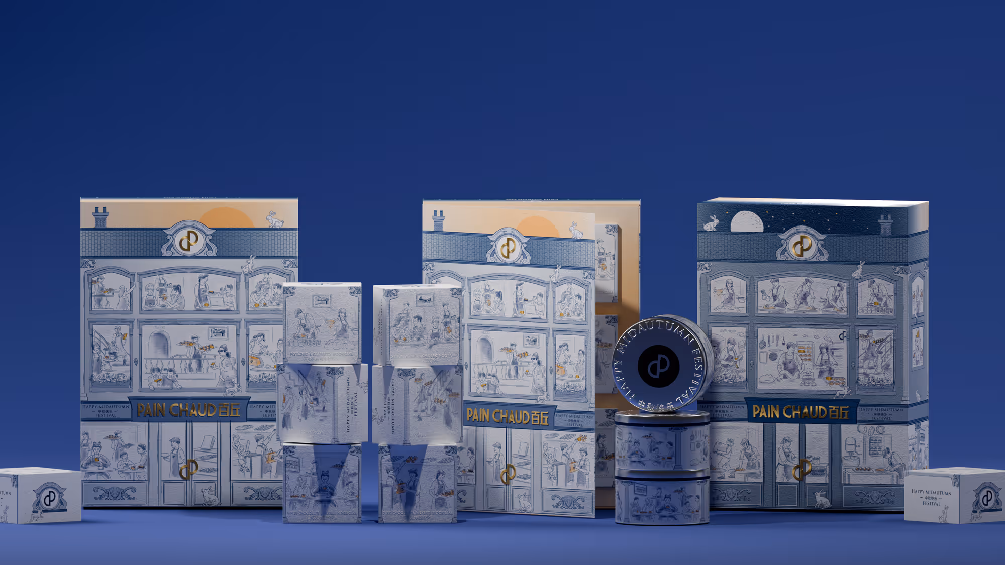 The design concept imagines an idealised PAIN CHAUD shop with the classic look-and-feel of a Parisian boulangerie. As well as including elements associated with Mid-Autumn Festival, the mooncake box itself is double sided through its design to show both day and night.