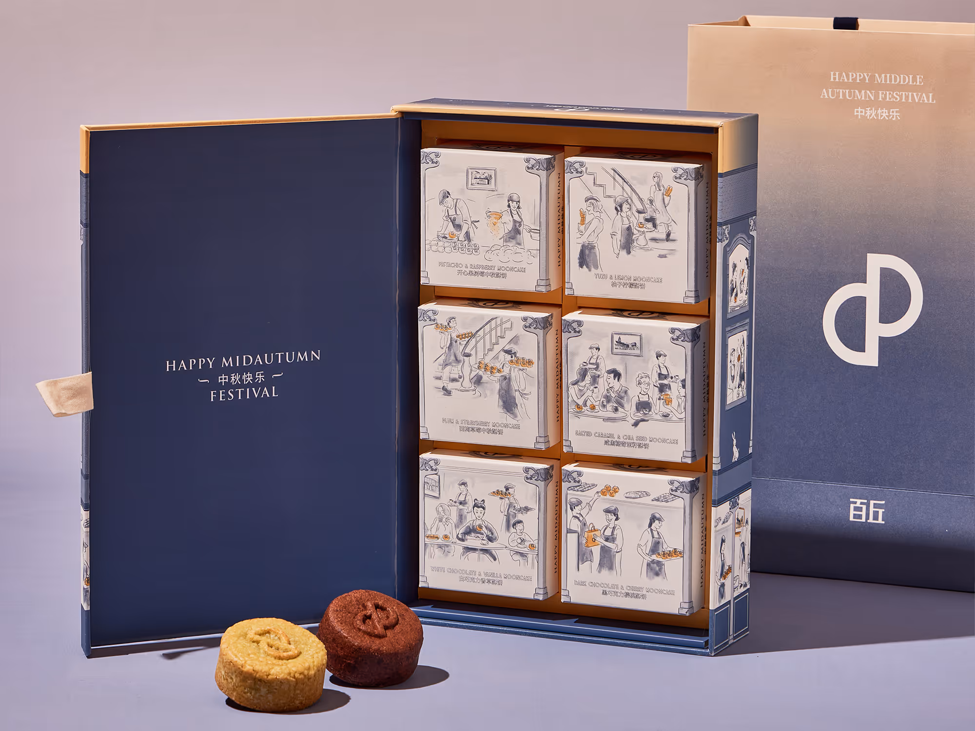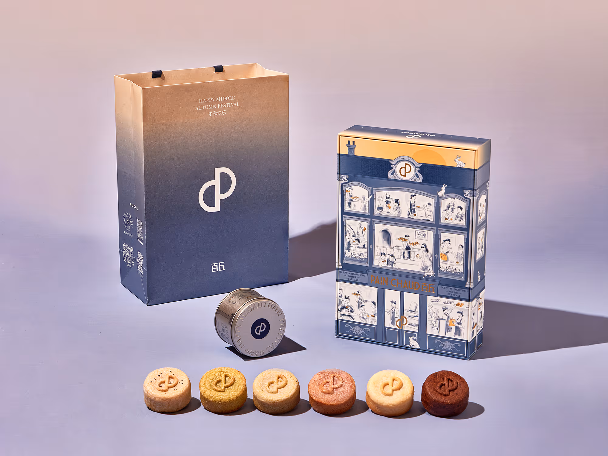 在「La Maison」這個主題的啟發下,我們將Pain Chaud設想為一家充滿巴黎風格的傳統麵包店。月餅盒不仅加入中秋元素,採用雙面設計,一面描繪了日間的場景,另一面則是夜晚的景象。